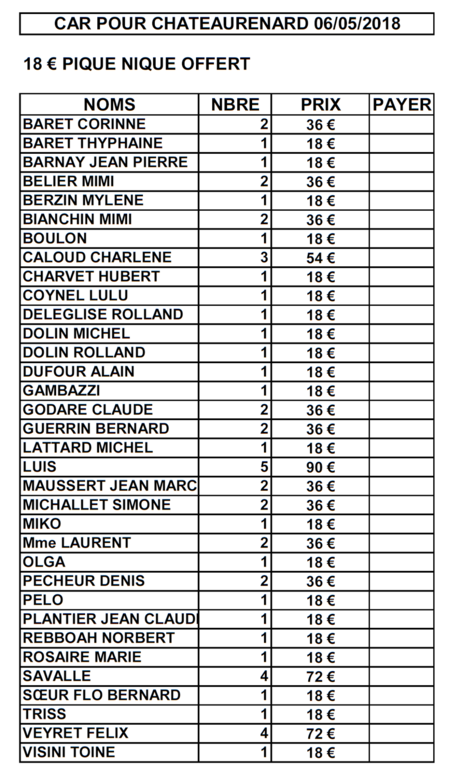 La liste des 55 inscrits pour le déplacement en car à Chateaurenard: départ 9h30 Règlement par chèque ou espèces Permanences Mardi, jeudi et vendredi de 18h à 19h au stade Vieux Melchior