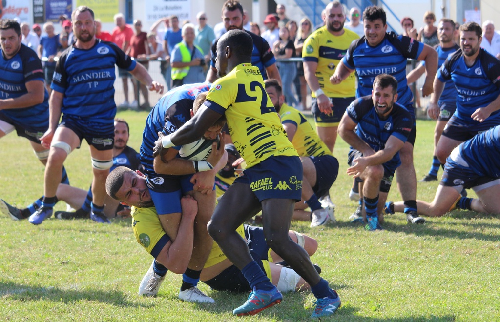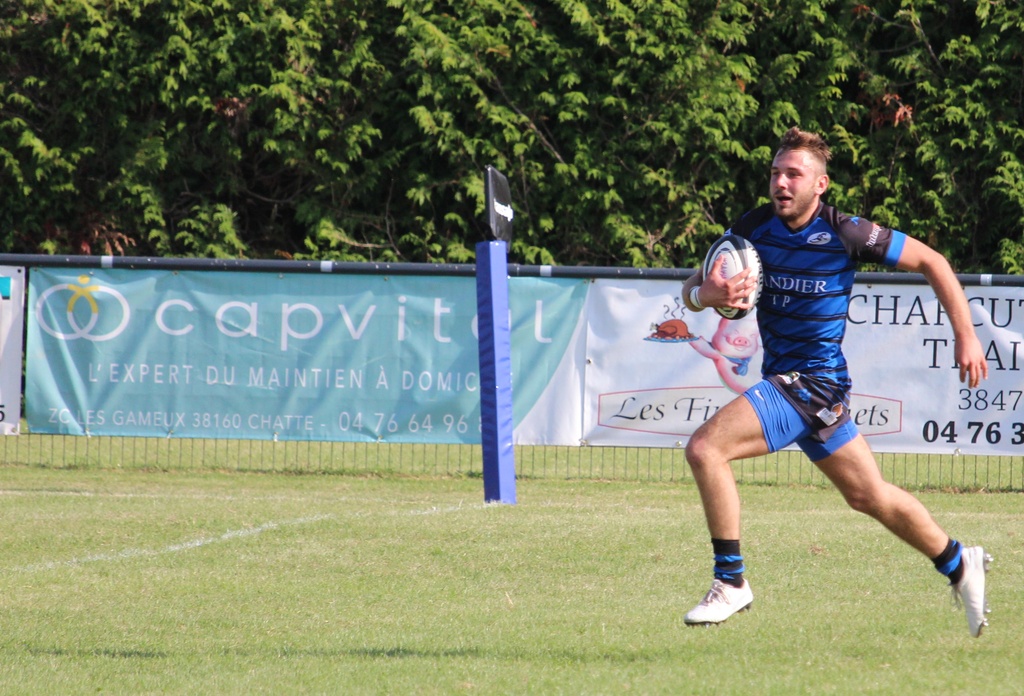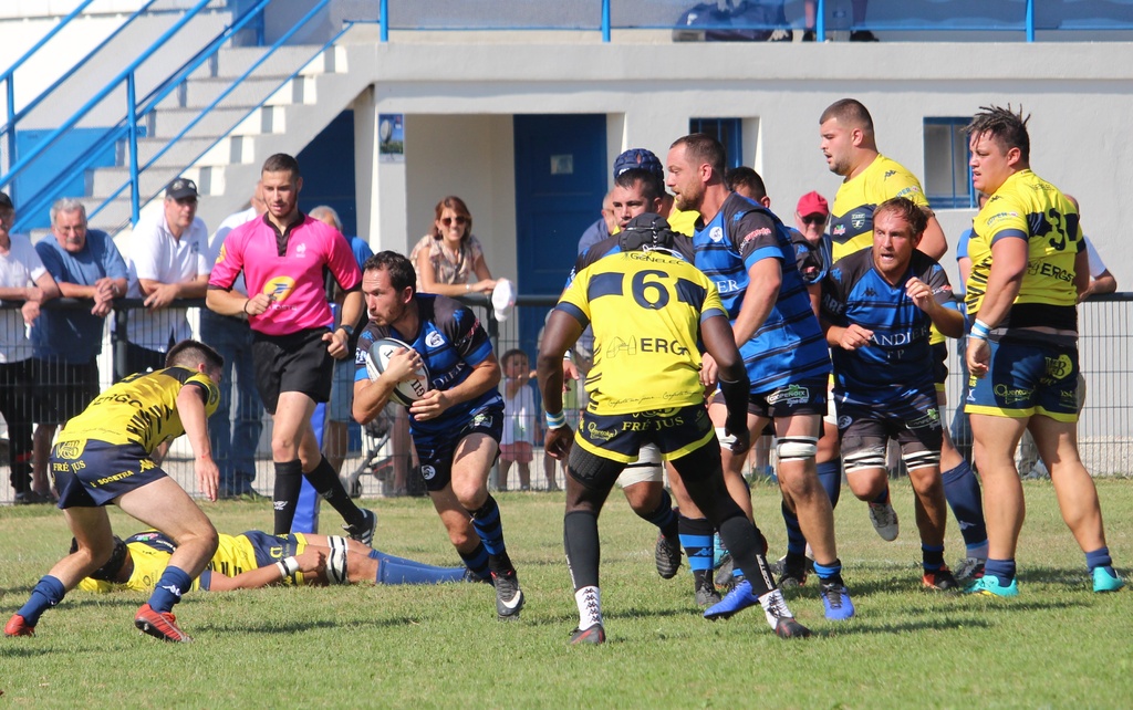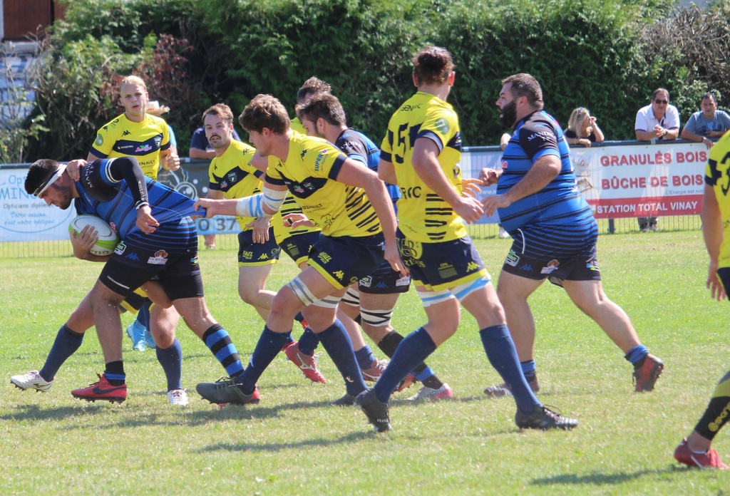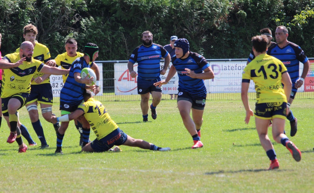 l’adversaire du jour, St Raphaël/Fréjus, qui sera probablement l’un des premiers de la classe en avril prochain n’était pas venu pour jouer aux billes. Les trois premiers points à mettre au crédit de Bastien Bonnet 3-0 (9e) mais les Vinois étaient rapidement punis par les trois-quarts Varois partis de leur camp. L’ailier Rémy Thimothee terminait sa course dans l’en-but malgré les défenseurs à ses trousses 3-5 (18e). En ce début de partie, les Provençaux, peut-être un peu trop confiants, ne profitaient pas des nombreuses fautes des bleus et noirs en cherchant des pénaltouches plutôt que de faire gonfler le score. Bon an, mal an, la récréation approchant, une pénalité de part et d’autre faisait évoluer le tableau noir 6-8. La sonnerie renvoyait tout le monde aux vestiaires juste avant l’heure du gouter. Nul doute que les coachs Antonin Rozand et Vincent Magallon profitaient de cet instant pour rappeler les consignes et tenter de corriger la copie. Un discourt bénéfique pour des Vinois qui retrouvaient des couleurs et récitaient parfaitement leurs tables. Un déboulé de Sevan Baridon permettait à Adrien Mandon de décrocher une bonne note 14-8 (56e). Le match s’emballait, les visiteurs revenaient au score presque immédiatement 14-13 (61e). Mais les guêpes allaient prendre les choses en main et dicter leur jeu. Adrien Mandon adressait un petit ballon à suivre dans le dos de la défense et Baptiste Ferrouillat arrivait le premier derrière la ligne 21-13 (63e). La confiance était revenue et du terrain aux tribunes, personne ne doutait plus de l’issue de la rencontre. Yann Villard concrétisait la leçon de réalisme par un essai en coin 29-13 (80e) et c’est Valentin Doucet, sur le coup d’envoi, qui allait activer ses grands compas dans une course de 45 mètres pour mettre un terme à cette journée. L’U.S.Vinay méritait largement cette victoire dans cette partie au-dessus de la moyenne. Les Carfistes allaient redescendre dans le sud le cartable un peu lourd.